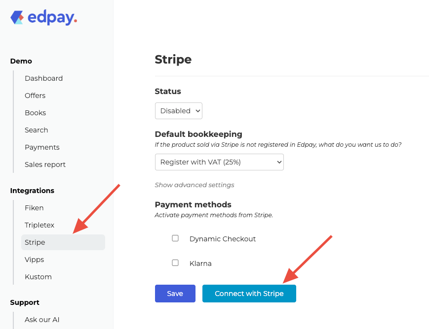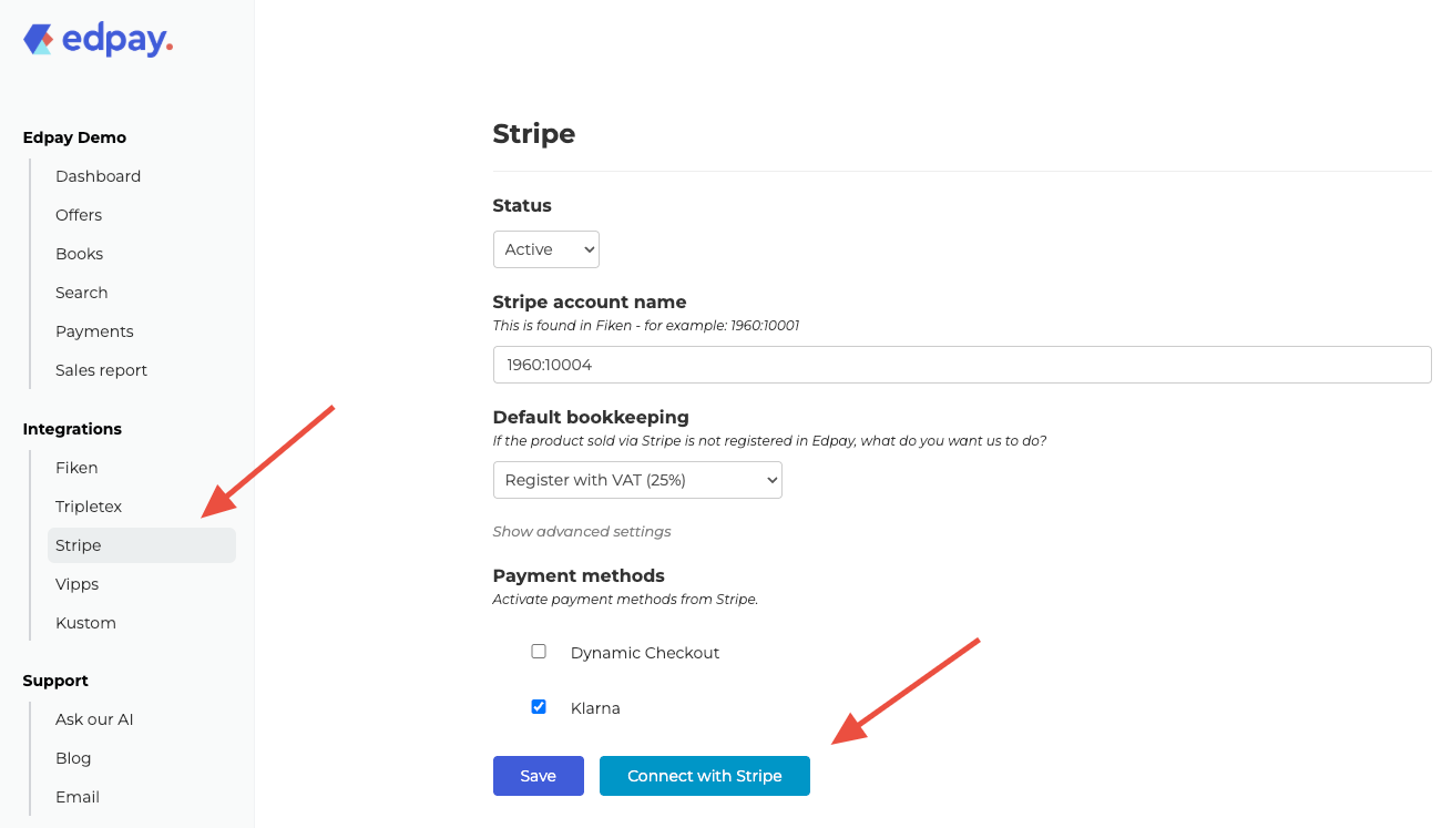 Trykk på “Connect with Stripe”